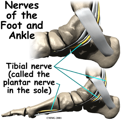 runs behind the medial malleolus. Another nerve crosses in front of the ankle on its way to top of the foot. There is also a nerve that passes along the outer edge of the ankle. The nerves on the of the ankle control the muscles in this area, and they give sensation to the top and outside edge of the foot.