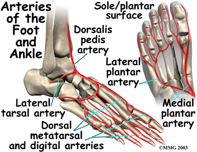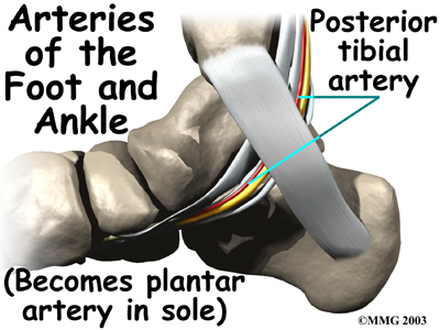 The ankle gets blood from nearby arteries that pass by the ankle on their way to the foot. The dorsalis pedis runs in front of the ankle to the top of the foot. (You can feel your pulse where this artery runs in the middle of the top of the foot.) Another large artery, called the , runs behind the medial malleolus. It sends smaller blood vessels to the inside edge of the ankle joint. Other less important from other directions also supply blood to the ankle.