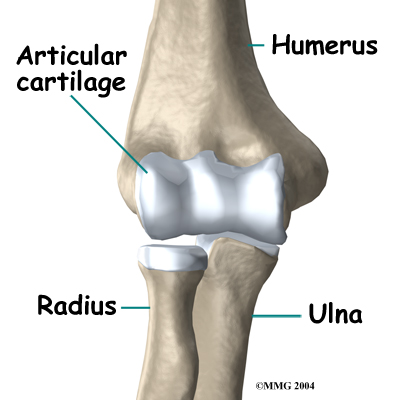 In the elbow joint, the ends of the bones are covered by articular cartilage — a slick, smooth, fibrous material. Articular cartilage protects the bone ends from creating friction when they rub together as the elbow moves. The cartilage is also soft enough to act as a shock absorber. If articular cartilage is protected from injury, it is robust enough to last a lifetime.