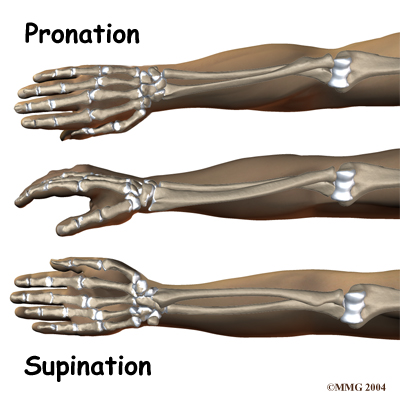 When the head of the radius spins on the capitellum, the forearm rotates to turn the palm up toward the ceiling (supination) or down toward the floor (pronation). The joint also hinges as the elbow bends and straightens.