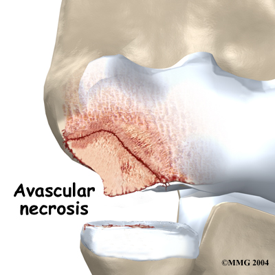 As the crack progresses, it may begin to separate. Eventually, the small piece of dead bone may break loose. This produces a separation between the articular cartilage and the subchondral bone, which is a condition called OCD. If the dead piece of bone completely detaches, it becomes a loose body that is free to float around the joint.