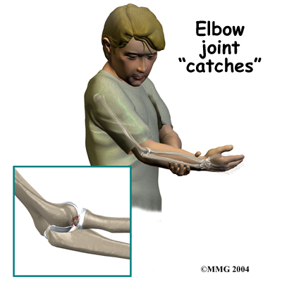In advanced cases of elbow OCD, the patient may notice that the joint grinds (called crepitus). The elbow may also catch or lock up occasionally. These sensations may mean that a loose body is floating around inside the elbow joint. The joint may also feel warm and swollen, and the muscles around the elbow may appear to have shrunk in size (atrophied).