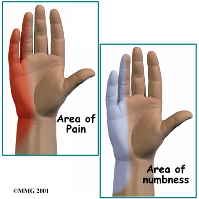 Numbness on the inside of the hand and in the ring and little fingers is an early sign of cubital tunnel syndrome. The numbness may develop into pain. The numbness is often felt when the elbows are bent for long periods, such as when talking on the phone or while sleeping. The hand and thumb may also become clumsy as the muscles become affected.