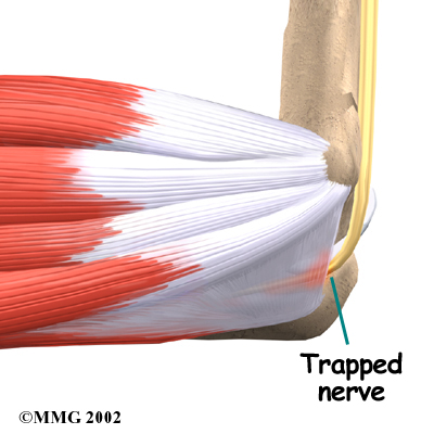 Cubital tunnel syndrome has several possible causes. Part of the problem may lie in the way the elbow works. The ulnar nerve actually stretches several millimeters when the elbow is bent. Sometimes the nerve will shift or even snap over the bony medial epicondyle. (The medial epicondyle is the bony point on the inside edge of the elbow.) Over time, this can cause irritation.