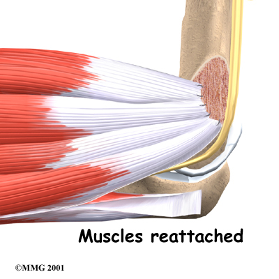 Active physical therapy usually starts six weeks after surgery. We will show you how to use your own muscle power in active range-of-motion exercises. Light isometric strengthening exercises are started. You may begin careful strengthening of your hand and forearm by squeezing and stretching special putty. These exercises work the muscles without straining the healing tissues.