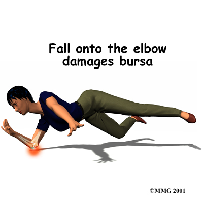 In some cases, a direct blow or a fall onto the elbow can damage the bursa. This usually causes bleeding into the bursa sac, because the blood vessels in the tissues that make up the bursa are damaged and torn. In the skin this would simply form a bruise, but in a bursa blood may actually fill the bursa sac. This causes the bursa to swell up like a rubber balloon filled with water.