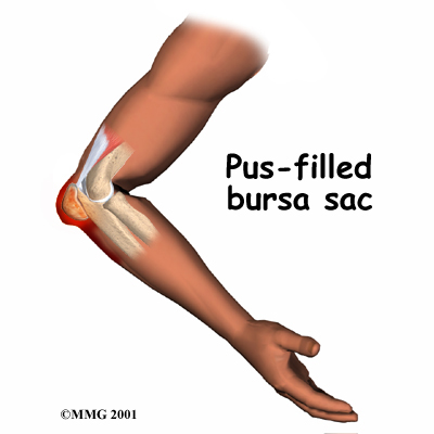 The olecranon bursa can also become infected. This may occur without any warning, or it may be caused by a small injury and infection of the skin over the bursa that spreads down into the bursa. In this case, instead of blood or inflammatory fluid in the bursa, it becomes filled with pus. The area around the bursa becomes hot, red, and very tender.