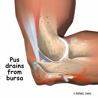 If the infection is slow to heal, the bursa may have to be drained surgically. This method is different than the nonsurgical drainage mentioned earlier. Surgery to drain the bursa begins with an incision to open the bursa. The skin and bursa are kept open by inserting a drain tube into the bursa for several days. This allows the pus to drain and helps the antibiotics clear up the infection.