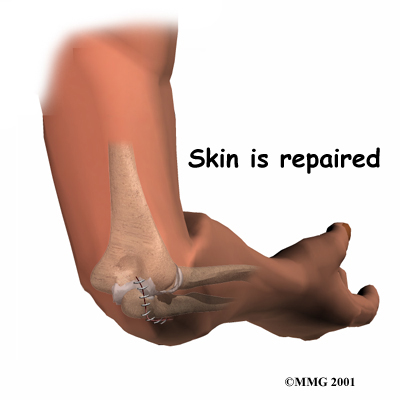To remove the olecranon bursa, an incision is made over the tip of the elbow. Since the bursa is outside of the elbow joint, the joint is never entered. The thickened bursa sac is removed, and the skin is repaired with stitches. Your elbow may be placed in a splint to rest the elbow and prevent it from moving for a few days. This allows the wound to begin to heal and prevents bleeding into the area where the bursa was removed.