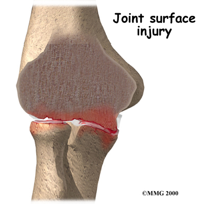 At the time of injury the cartilage surface may not look any different if it has not been directly injured. The injury to the cartilage often doesn't show up until months later. In some cases, however, the damage to the cartilage with the initial injury is severe. Pieces of the cartilage can actually be ripped away from the bone and these pieces do not grow back. Usually they must be surgically removed otherwise they cause problems with the functioning of the joint. If the pieces aren't removed, they may float around in the joint, causing it to catch. These pieces are referred to as loose bodies or joint mice.  In addition to catching in the joint they can also cause a lot of pain and do more damage to the joint surfaces if left inside the joint.