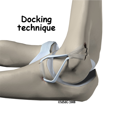 If the ulnar collateral ligament has been injured acutely due to a fall on the outstretched arm, a direct repair of the ligament may be possible. If the ligament has pulled off the bone, it may be reattached with sutures through holes drilled in the bone. If the ligament is damaged by constant overuse and is not strong enough to restore stability to the elbow joint if it is simply re-attached or repaired, then the ligament must be replaced with a new ligament. This is termed a ligament reconstruction. During a reconstruction, the ulnar collateral ligament along the medial (inside) of the elbow is replaced with a tendon graft harvested from somewhere else in the body (autograft). One common technique used to replace the damaged ulnar collateral ligament is called the technique.