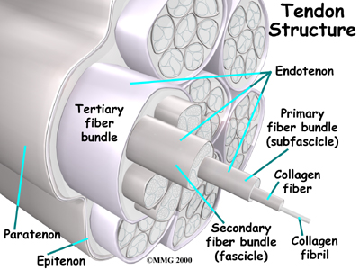Chronic overuse or long term inflammation may contribute to changes in the Achilles tendon, leading to degeneration and thickening of the tendon. As mentioned above, studies show that although inflammation may have contributed to the initial changes in the tendon, there is no acute sign of inflammation in chronically painful tendons. Most experts now refer to this chronic condition as tendonosis or tendinopathy instead of the acute diagnosis of paratendonitis or tendonitis. Acute inflammation, however, is not a precursor to the development of tendonosis. The degeneration and thickening of the achilles tendon that is the hallmark of a tendonosis diagnosis can also develop over time simply from general wear and tear. Tendons are made up of strands of a material called collagen. (Think of a tendon as similar to a nylon rope and the strands of collagen as the individual nylon strands.) Degeneration in a tendon usually shows up as a loss of the normal arrangement of the fibers of the tendon. Some fibers even break (microtears,) and the tendon loses overall strength.