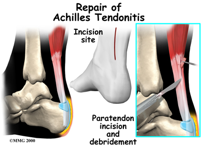 In some cases of persistent tendonitis or tendonosis a procedure called debridement of the Achilles tendon may be suggested to help treat the problem. This procedure is usually done through an incision on the back of the ankle near the Achilles tendon. The tendon is identified, and any inflamed paratenon tissue (the covering of the tendon) is removed. In the case of tendonosis the tendon is then split, and the degenerative portion of the tendon is removed. The split tendon is then repaired and allowed to heal. It is unclear why, but removing the degenerative portion of the tendon seems to stimulate repair of the tendon to a more normal state.