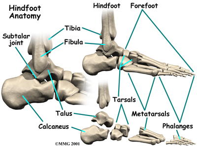 The two bones that make up the ‘hindfoot’ include the talus and the calcaneus, or heel bone. The talus is connected to the calcaneus at the subtalar joint. The ankle joint where the talus connects to the tibia and fibula allows the foot to bend up and down. The subtalar joint allows the foot to rock from side to side.