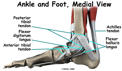 The large Achilles' tendon, at the back of the ankle, is one of the most important tendons for walking, running, and jumping. It attaches the calf muscles to the heel bone to allow us to rise up on our toes. The posterior tibial tendon attaches one of the smaller muscles of the calf to the underside of the foot. This tendon helps support the arch and allows us to turn the foot inward. Failure of the posterior tibial tendon is a major problem in many cases of AAFD.