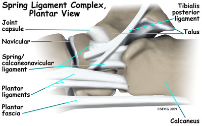 The spring ligament complex is often involved in AAFD. This group of ligaments supports the talonavicular joint. The spring ligament complex works with the posterior tibial tendon and the plantar fascia to support and stabilize the longitudinal arch of the foot.