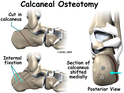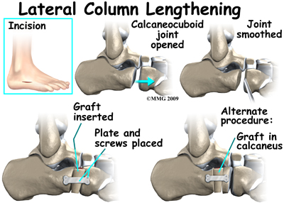 The most common surgical procedures used with this condition include arthrodesis (fusion), osteotomy (cutting out a wedge-shaped piece of bone), and lateral column lengthening. Lateral column lengthening involves the use of a bone graft at the calcaneocuboid joint, which helps restore the medial longitudinal arch (arch along the inside of the foot).