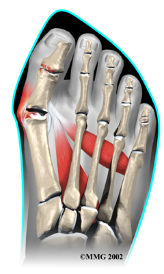 Realignment of the big toe is then done by releasing the tight structures on the lateral, or outer side of the first MTP joint. This includes the tight joint capsule and the tendon of the adductor hallucis muscle. This muscle tends to pull the big toe towards the middle of the foot. By releasing the tendon, the toe is no longer pulled out of alignment. The toe is realigned and the joint capsule on the side of the big toe closest to the other foot is tightened to keep the toe straight, or balanced.