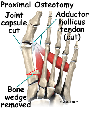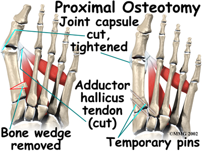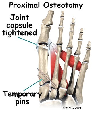 In other situations, the first metatarsal is cut at the near end of the bone (called a proximal osteotomy.) This type of procedure usually requires two or three small incisions in the foot. Once the skin is opened the surgeon performs the osteotomy. The bone is then realigned and held in place with metal pins until it heals at which point the pins are removed. Again, this reduces the angle between the first and second metatarsal bones.