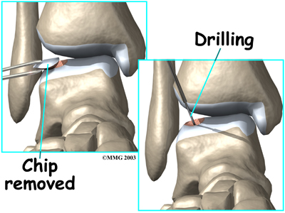 Surgery usually involves removing the loose fragment of cartilage and bone from the ankle joint and drilling small holes in the injured bone. When the fragment is removed, a defect shaped like a small crater is left in the talar dome. It is this area where the drill holes are made. The drill holes allow new blood vessels to grow into the defect and help to form scar tissue to fill the area. Eventually this new scar tissue smoothes out the defect and allows the ankle to move more easily.