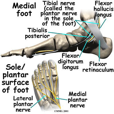 The runs into the foot behind the medial malleolus, the bump on the inside of the ankle. As it enters the foot, the nerve runs under a band of fibrous tissue called the flexor retinaculum. The flexor retinaculum is a dense band of fibrous tissue that forms a sort of tunnel, or tube. Several tendons, as well as the nerve, artery, and veins that travel to the bottom of the foot pass through this tunnel. This tunnel is called the tarsal tunnel. The tarsal tunnel is made up of the bone of the ankle on one side and the thick band of the flexor retinaculum on the other side.