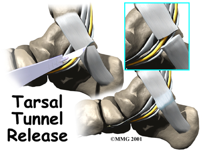 The surgeon then makes a small incision in the skin behind the inside ankle bone (medial malleolus). The incision is made along the course of the tibial nerve where it curves behind the malleolus. The nerve is located and released by cutting the flexor retinaculum. The surgeon will then surgically follow the nerve into the foot, making sure the nerve is free of pressure throughout its course.