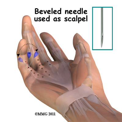 A less invasive procedure called a needle aponeurotomy (also referred to as a percutaneous fasciotomy) is available when the disease is at an early stage. Under local anesthesia, the surgeon inserts a very thin needle under the skin. The sharp needle cuts a path through the cord, weakening it enough to stretch and extend it, or rupture it.