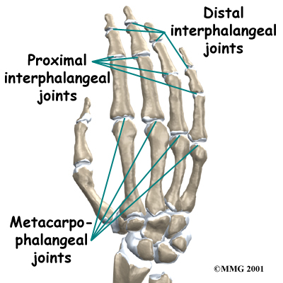 The work like hinges when the fingers bend and straighten. The main knuckle joint is the metacarpophalangeal joint (MCP joint). It is formed by the connection of the metacarpal bone in the palm of the hand with the first finger bone, or proximal phalanx. Each finger has three phalanges, or small bones, separated by two interphalangeal joints (IP joints). The one closest to the MCP joint (knuckle) is called the proximal IP joint (PIP joint). The joint near the end of the finger is called the distal IP joint (DIP joint).