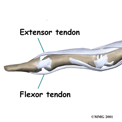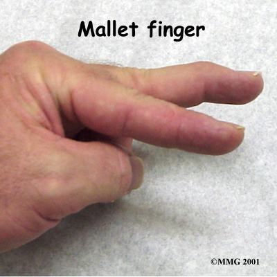 A mallet finger results when the extensor tendon is cut or torn from the attachment on the bone. Sometimes, a small fragment of bone may be pulled, or avulsed, from the distal phalanx. The result is the same in both cases: the end of the finger droops down and cannot be straightened.