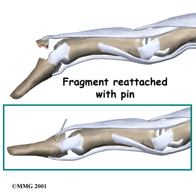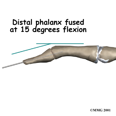 If the damage cannot be repaired using pin fixation, finger joint fusion may be needed. Joint fusion is a procedure that binds the two joint surfaces of the finger together, keeping them from rubbing on one another. Fusing the two joint surfaces together eases pain, makes the joint stable, and prevents additional joint deformity.