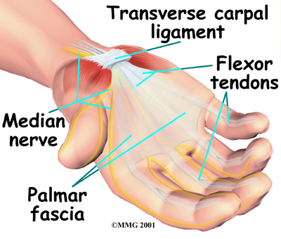 The median nerve, as well as the flexor tendons of the fingers pass through the carpal tunnel. The median nerve rests on top of the tendons, just below the carpal ligament. Between the skin and the carpal ligament is a thin sheet of connective tissue called the palmar fascia.