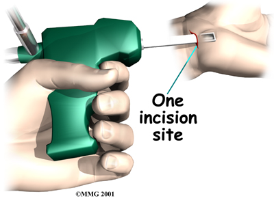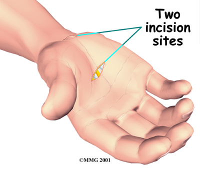 The surgeon nicks the skin to create a small opening just below the crease in the wrist where the palm starts. This opening allows the surgeon to place the endoscope into the carpal tunnel. Some surgeons make a second small incision within the palm of the hand, however the procedure using a single incision is becoming more popular. The incision allows the surgeon to open the carpal tunnel just below the carpal ligament.