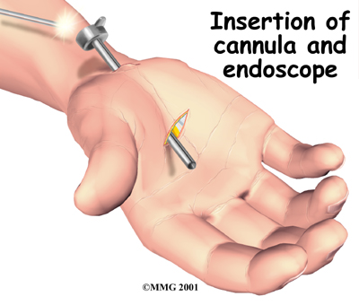 Once the surgeon is sure that the instruments can be passed into the carpal tunnel, a metal or plastic cannula (a tube with a slot on the side) is placed alongside the median nerve. The endoscope can be placed into the tube to look at the underside of the carpal ligament, making sure that the nerves and arteries are safely out of the way.