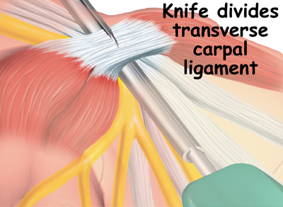 A special knife is inserted through the cannula. This knife has a hook on the end that cuts backwards when the knife is pulled back out of the cannula. Once the knife is pulled all the way back, the carpal ligament is divided, without cutting the palmar fascia or the skin of the palm.