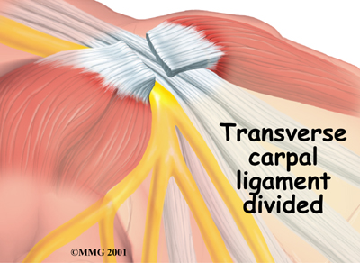 After the carpal ligament is released, the surgeon stitches just the skin openings and leaves the loose ends of the carpal ligament separated to keep pressure off the median nerve. Eventually, the gap between the two ends of the ligament fills in with scar tissue.