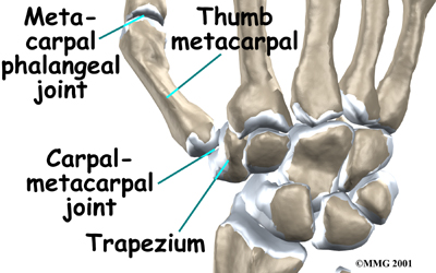 The carpometacarpal joint (or CMC joint) of the thumb is where the metacarpal bone of the thumb attaches to the trapezium bone of the wrist. This joint is sometimes referred to as the basal joint of the thumb. The CMC joint is the one that allows you to move your thumb into your palm, a motion called opposition.