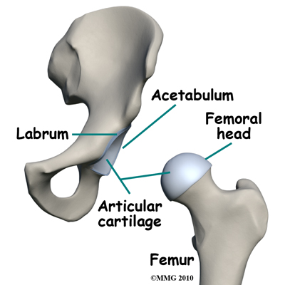 The result is a shearing force on the labrum and the articular cartilage, which is located next to the labrum. The labrum is a dense ring of fibrocartilage firmly attached around the acetabulum (socket). It provides depth and stability to the hip socket. The articular cartilage is the protective covering over the hip joint surface.
