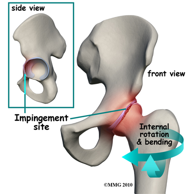 The basic problem is that the head of the femur butts up against the cartilage rim around the acetabulum and pinches it. An alternate type of femoral acetabular impingement causes abnormal jamming of the head-neck junction.