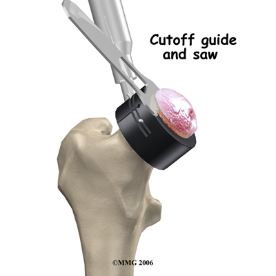 The operation begins by making an incision in the side of the thigh. This allows the surgeon to see both the femoral head and the acetabulum (or socket). The femoral head is then dislocated out of the socket. Special powered instruments are used to the bone of the so that the new metal surface will fit snugly on top of the bone.