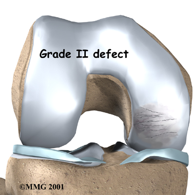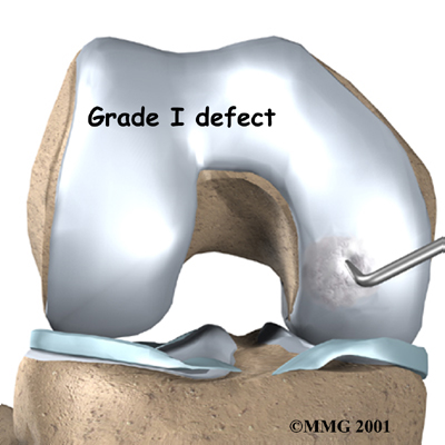 Surgeons classify defects in the knee cartilage using a grading scale from I (one) to IV (four). In a grade I tear, the cartilage has a soft spot. Grade II lesions show minor tears in the surface of the cartilage. Grade III lesions have deep crevices. In grade IV lesions, the tear goes all the way to the underlying bone.