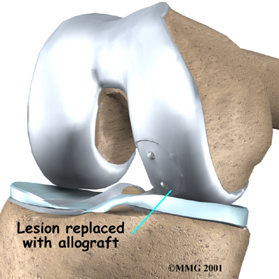 An osteochondral allograft is a lot like the osteochondral autograft described above. But instead of taking tissue from the patient's donor site, surgeons rely on tissue from another person, much like using donor hearts, kidneys, and other organs. The procedure is mostly used for OCD after other surgeries have failed. It is not recommended for patients with osteoarthritis. One of the problems with this kind of procedure is the limited supply of donor tissue. Even though there are technical difficulties with this type of surgery, the success rate is generally high. This procedure usually involves placing rather large pieces of cartilage and bone in the joint. The allograft is usually held in place with metal screws or pins.