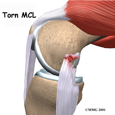 If an injury causes these ligaments to stretch too far, they may tear. The tear may occur in the middle of the ligament, or it may occur where the collateral ligament attaches to the bone, on either end. If the force from the injury is great enough, other ligaments may also be torn. The most common combination is a tear of the MCL and a tear of the anterior cruciate ligament (ACL). The ACL runs through the center of the knee and controls how far forward the tibia moves in relation to the femur.
