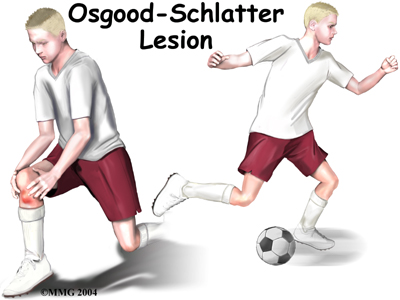 An Osgood-Schlatter lesion involves pain and swelling in the small boney bump on the front of the tibia (shinbone), right below the kneecap. It primarily occurs in children and adolescents. The problem affects the area where bone growth occurs. Too much stress on the growing bone causes the pain and swelling. The pain often worsens with activity and eases with rest. Fortunately, the condition is not serious and it is usually only temporary.