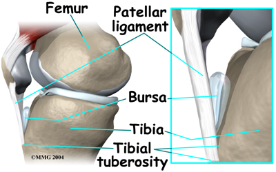 A small bursa sometimes develops where the patellar tendon meets the tibial tuberosity. A bursa is a normal structure that often forms in areas where friction occurs, such as between muscles, tendons, and bones. A bursa is a thin sac of tissue filled with fluid. The fluid lubricates the area and reduces friction. If too much friction occurs, however, the bursa can swell and become a problem itself.