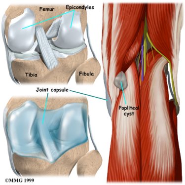 A popliteal cyst is a small, bag-like structure that forms when the joint lining produces too much fluid in the knee. The extra fluid builds up and pushes through the back part of the joint capsule, forming a cyst. The cyst squeezes out toward the back part of the knee in the area called the , the indentation felt in the back part of the knee between the two hamstring tendons and the top part of the calf muscle.