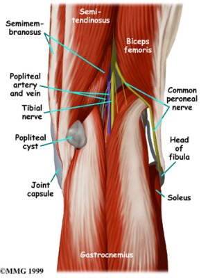A popliteal cyst forms very near the of the leg. It is possible that these structures can be injured during surgery.