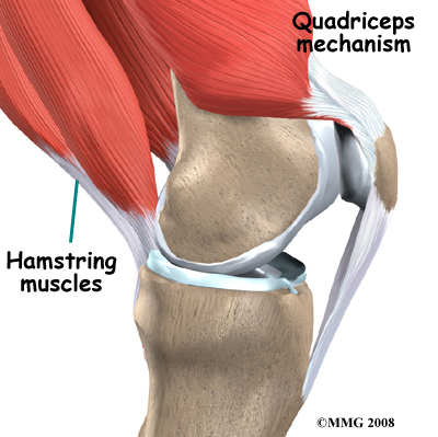 Tightening up the quadriceps muscles places a pull on the tendons of the quadriceps mechanism. This action causes the knee to straighten. The patella acts like a fulcrum to increase the force of the quadriceps muscles.