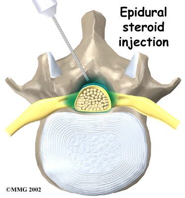 Some patients are given an (ESI). The spinal cord is covered by a material called dura. The space between the dura and the spinal column is called the epidural space. It is thought that injecting steroid medication into this space fights inflammation around the nerves, the discs, and the facet joints. This can reduce swelling and give the nerves more room inside the spinal canal.