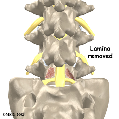 When the vertebra slips forward, the nearby nerves that exit the spine can become pinched or irritated. In addition, the size of the spinal canal in the problem area shrinks, placing pressure on the nerves inside the canal. To fix this, the lamina of the bony ring is removed to ease pressure on the nerves. The procedure to remove the lamina and release pressure on the nerves is called . Decompression alone is usually not advised. Studies show much better results when the operation is combined with a fusion of the involved vertebrae (see below).