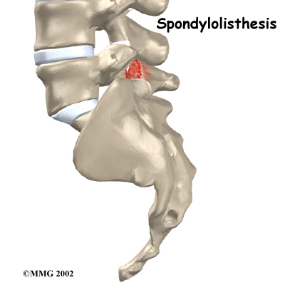 A condition called spondylolysis can lead to the slippage that happens with spondylolisthesis. Spondylolysis is a defect in the bony ring of the spinal column. It affects the pars interarticularis, mentioned earlier. This defect is most commonly thought to be a stress fracture that happens from repeated strains on the bony ring. Participants in gymnastics and football commonly suffer these strains. Spondylolysis can lead to the spine slippage when a fracture occurs on both sides of the bony ring. This slippage is called spondylolisthesis. The slippage is from I through IV, one being mild, IV often causing neurological symptoms. The back section of the bony ring separates from the main vertebral body, so the injured vertebra is no longer connected by bone to the one below it. In this situation, the facet joints can't provide their normal support. The vertebra on top is then free to slip forward over the one below.